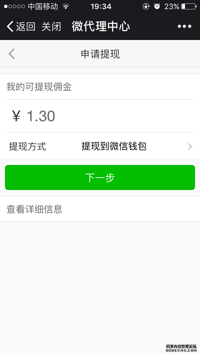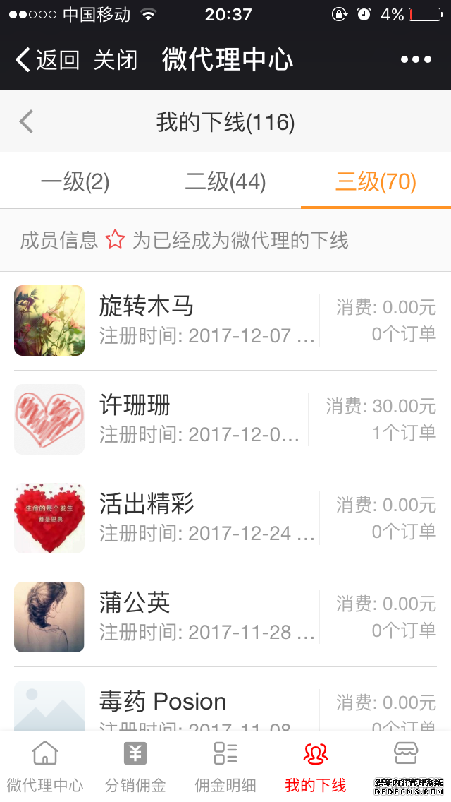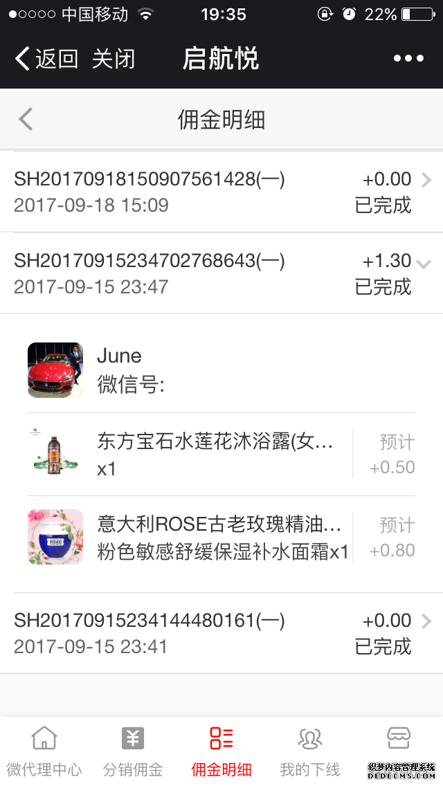 分销商详情支持查看某分销商所有分销订单信息、发展的所有下线以及佣金数量